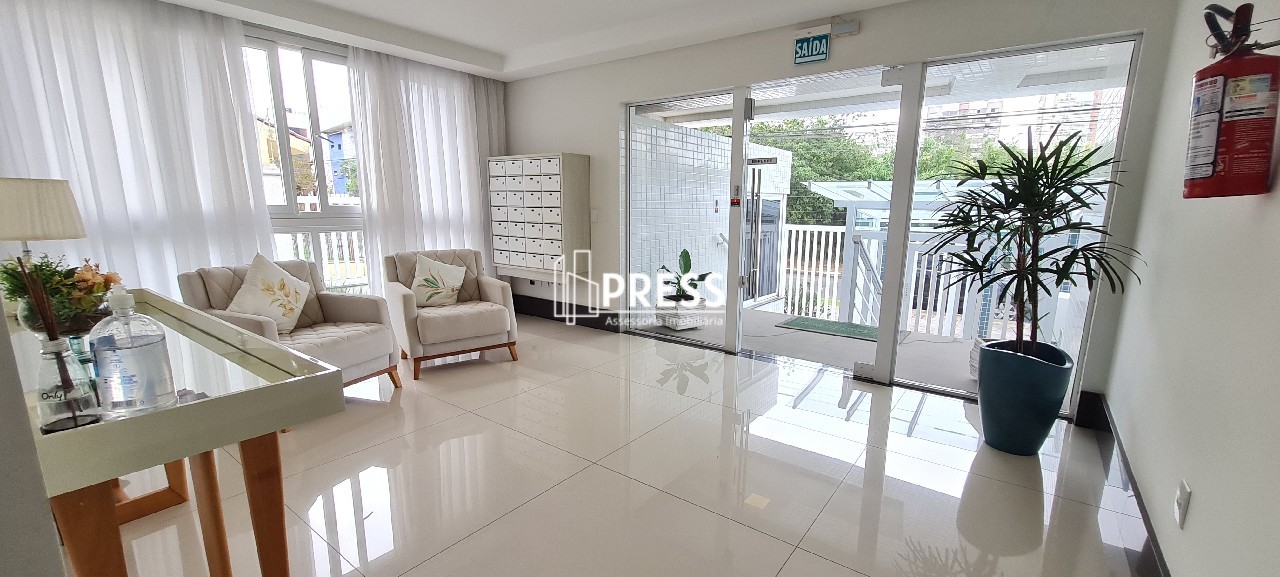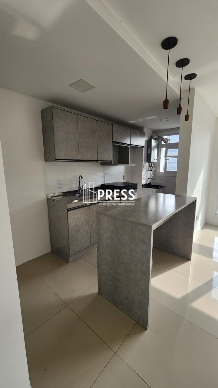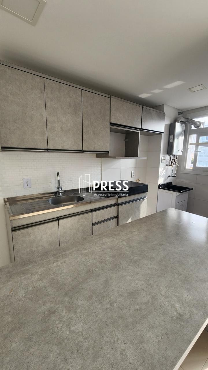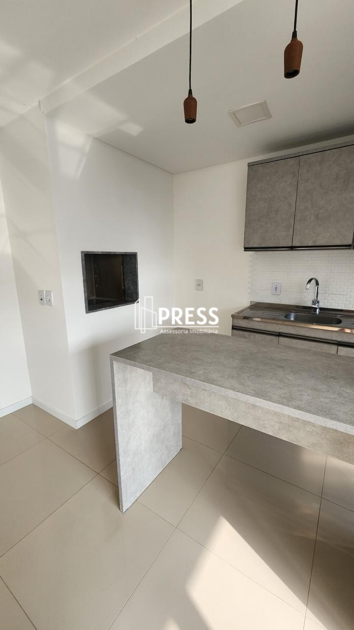 Um apartamento andar alto, bem iluminado, ensolarado, com móveis sob medida, piso porcelanato, luminária, cozinha com churrasqueira integrada com o living com móveis planejados e garagem 02 carros.