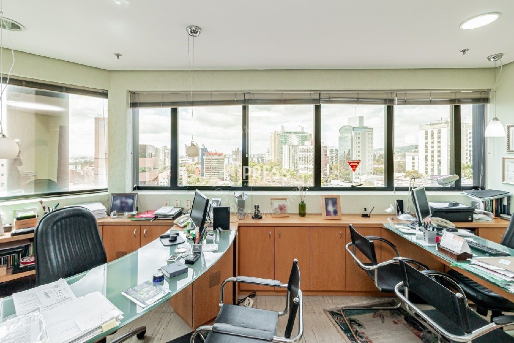 PRESS aluga alto padrão, lindo conjunto comercial com 135m² de área privativa, possui bela recepção, 02 banheiros, 05 salas individuais, sala de espera para cliente, cozinha e 03 vagas de garagem.Andar alto com belissima vista panorâmica inclusive para o Guaiba.