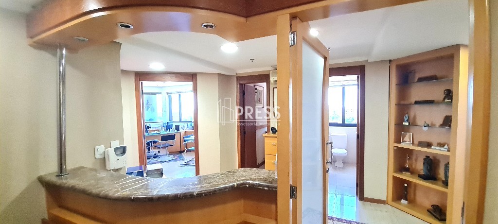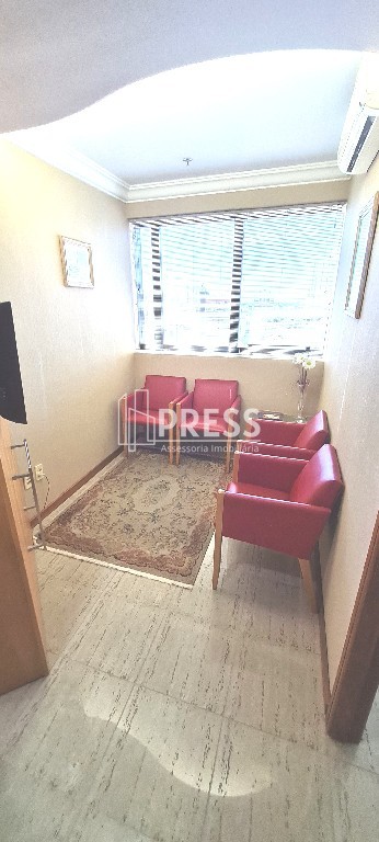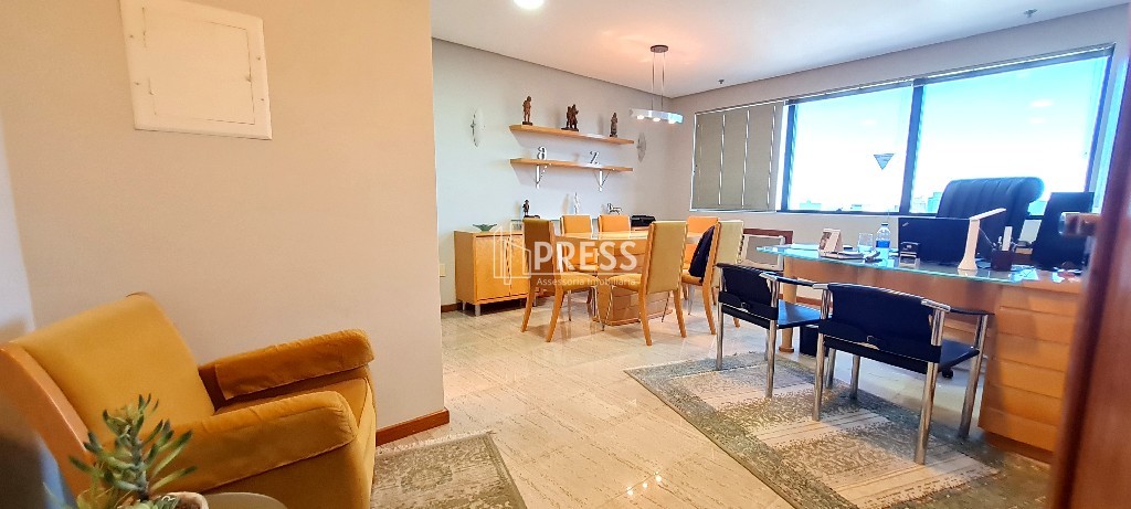 Possui 04 ar condicionado e 02 split, 03 vagas de garagem, móveis sob medida, belas mesas e cadeiras de traballho, mesa de reunião, uminárias, cortinas, .