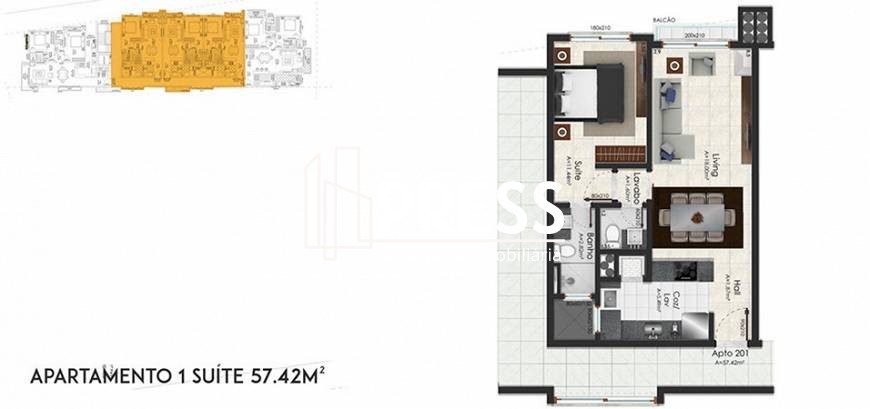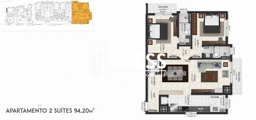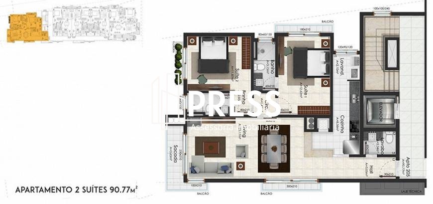 2 Suítes, Salas de Estar e de Jantar; Lavabo; Cozinha; Lavanderia; espera para lareira e calefação e Split; churrasqueira. 1 Box privativo. Vai ser entregue já com o piso laminado nos Dormitórios e nas Salas e com o piso frio (porcelanato) nos Banheiros, Cozinha e nas Áreas.