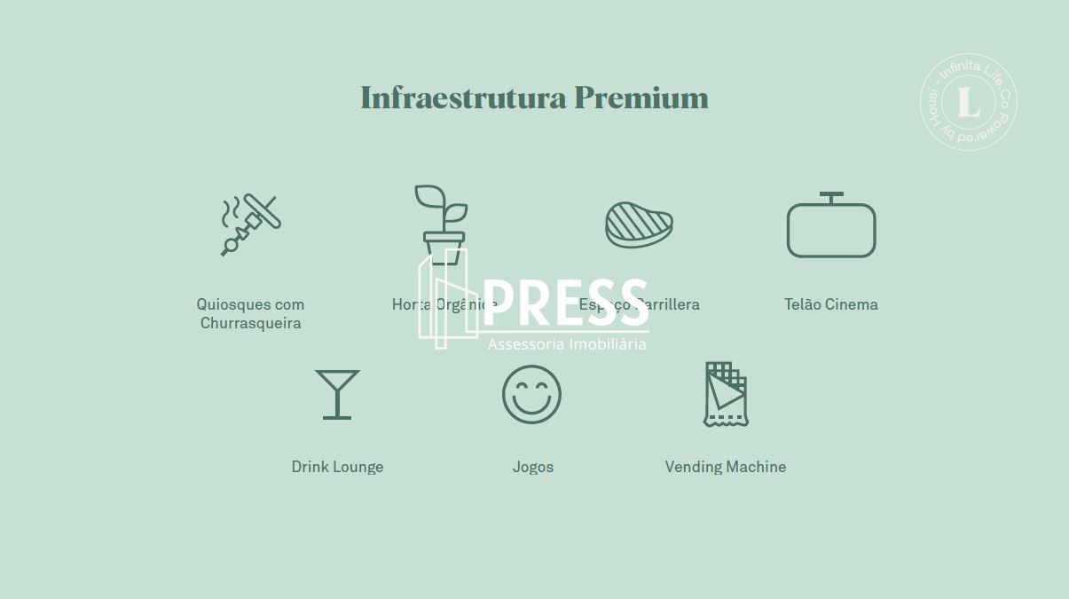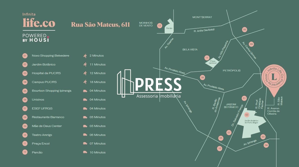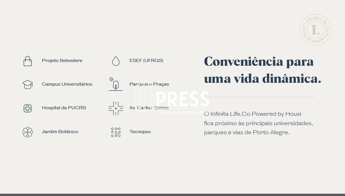 Press Assessoria Imobiliária vende apartamentos Studio com sacada e 01 dormitórios com lavabo e suite no mais novo lançamento da Infinita, o Life.CoLocalizado num ponto super estratégico da cidade, Life.Co fica próximo às principais universidades, parques e vias de Porto Alegre. Apartamentos 100% completos e mobiliados, pronto para você morar ou alugar. Infra estrutura Premium. Venha conhecer essa oportunidade conosco.